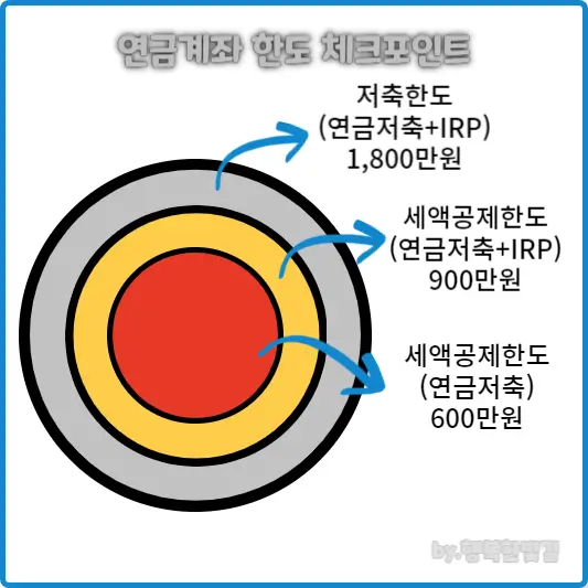 저축한도는 개인이 가지고 있는 연금계좌를 모두 합해서 1,800만 원까지입니다. 세액공제되는 한도는 IRP 900만 원, 연금저축 600만 원까지입니다. 만약에 연금저축이 없고 IRP계좌에 900만 원을 모두 넣었다면 900만 원 세액공제를 받을 수 있습니다. 사진과 같이 연금저축은 IRP의 세액공제한도 안에 속해있어서 연금저축을 600만 원 넣어 세액공제를 받았다면 IRP는 300만 원까지 공제받을 수 있습니다.