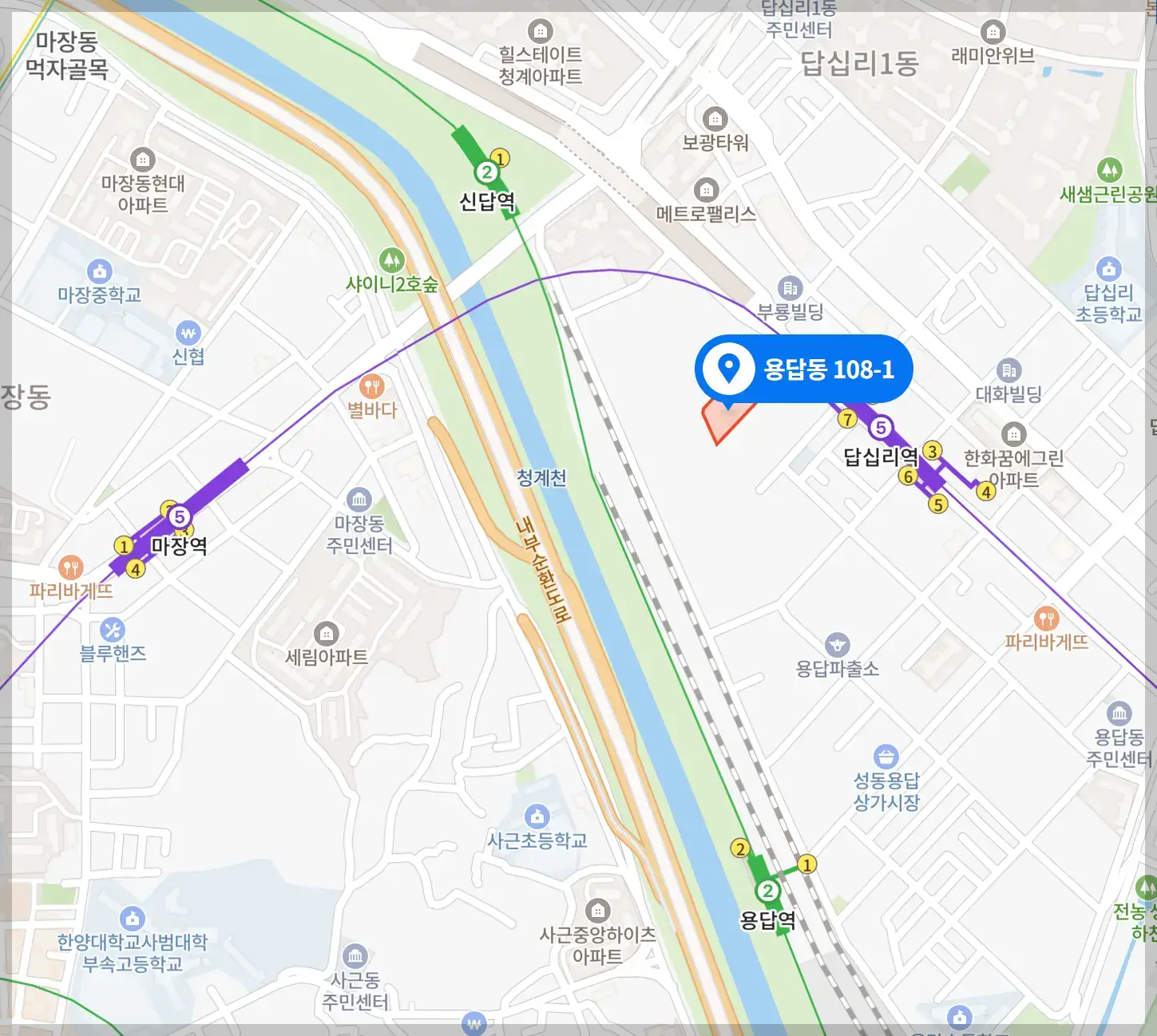 사진에서 보듯 한양대학교병원, 이마트, 마장축산물시장 등 모두 2km 내에 위치하고 있어 편리한 생활이 가능할 것으로 보입니다.